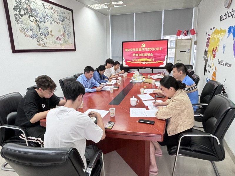 2024年4月23日上午,国际学院直属党支部在善学楼505会议召开党纪学习教育启动部署会,学院领导班子成员及全体师生党员参加会议,会议由直属党支部书记何雄卫主持。