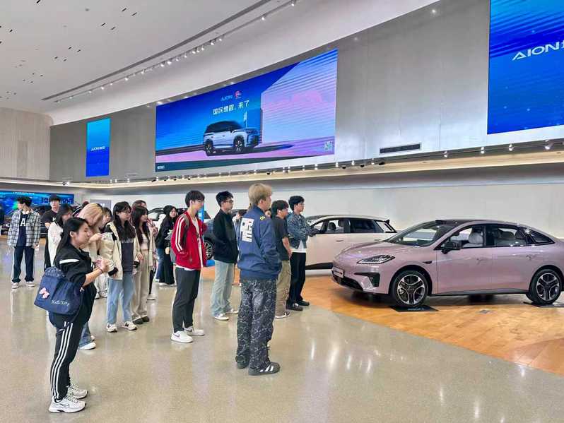 随后,学生们前往广汽埃安新能源汽车工厂,深入生产线感受“智造魅力”。在汽车材料展厅,讲解员对于新能源汽车电池技术以及操控系统进行分解式讲解;在总装车间,各项生产线有条不紊的进行组装调试,机械臂精准完成挡风玻璃的调整及安装,自动化率高达 100%;数字化系统实时监控生产进度,工程师可实时关注每辆车的组装过程确保组装精密度达标,确保出厂汽车无安全隐患。本次“移动课堂”通过现场参观深入汽车组装一线,让学生们对新能源汽车制造的精细化与安全性有了更深刻的认知。